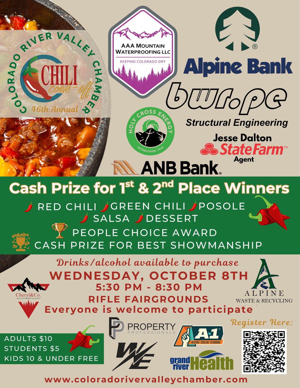 The Colorado River Valley Chamber’s 46th Annual Chili Cook-Off is heating up on Wednesday, October 8th, from 5:30 – 8:30 PM at the Rifle Fairgrounds! We’re looking forcontestantsready to showcase their bestred chili, green chili, posole, salsa, or dessert. Compete forcash prizes, People’s Choice, and Best Showmanship!